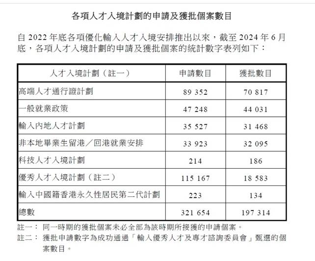從目前數據來看,港府已經超額完成吸引人才“指標”。據立法會披露的文件,截至2024年6月底,經過各項人才入境計劃共接收了超過32萬份申請,其中近20萬宗申請已獲批準,超過13萬名人才已經抵達香港。根據香港入境事務處最新公布的統計數據,2024年第一季度,成功獲批的申請案例數量上升至2,735宗,較去年同期增加了662宗,實現了約32%的顯著增長。