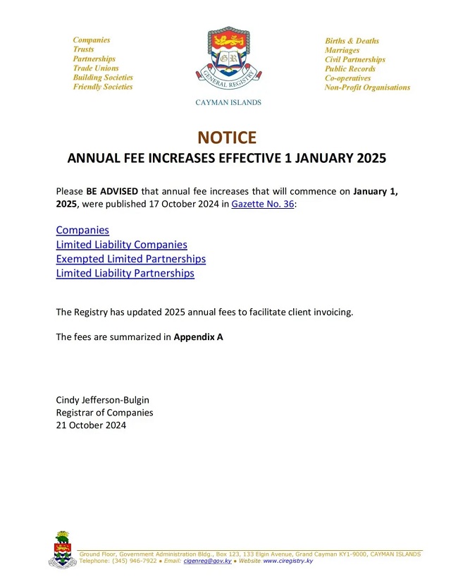 根據(jù)開曼群島金融服務(wù)部于2024年10月21日正式發(fā)布的公告,隨著《公司法》(2024年附表5 修正案),《有限責(zé)任公司(費用)》(2024年修正案),《豁免有限合伙企業(yè)(第2號)實施細(xì)則》(2024年修正案),《有限責(zé)任合伙企業(yè)(費用)實施細(xì)則》(2024年修正案) 等一系列修正案在政府憲報刊登,公司、有限責(zé)任公司、豁免有限合伙企業(yè)和有限責(zé)任合伙企業(yè)的年費變更將于2025年1月1日正式生效。