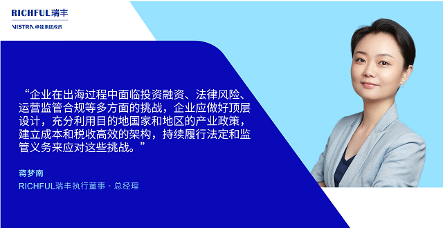 除了金融服務,企業出海還需考慮多方面因素。RICHFUL瑞豐執行董事、總經理蔣夢南與《中國經營報》記者分享,企業在出海過程中面臨投資融資、法律風險、運營監管合規等多方面的挑戰,企業應做好頂層設計,充分利用目的地國家和地區的產業政策,建立成本和稅收高效的架構,持續履行法定和監管義務來應對這些挑戰。