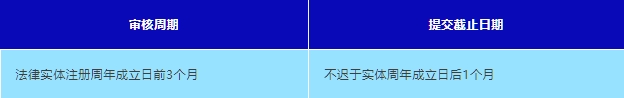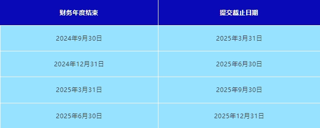 在財務年度結束后6個月內提交。大型實體和非大型非控股實體必須準備年度財務總結,并保存在其注冊辦公室。常見截止日期:
